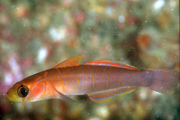 2001.9.2 撮影 川奈ビーチ 水深:10m 三浦半島や真鶴などではよく見られるそうですが、伊豆では、珍しい部類に当たります。 川奈では、沖合いに幼魚が群れを作っていたらしく、初夏には、アオリイカの魚礁のところに、居ついていたので、びっくりしました。 暗いところでは地味な赤い色をしていますが、光を当てると、美しい体色が輝いてくる魚です。